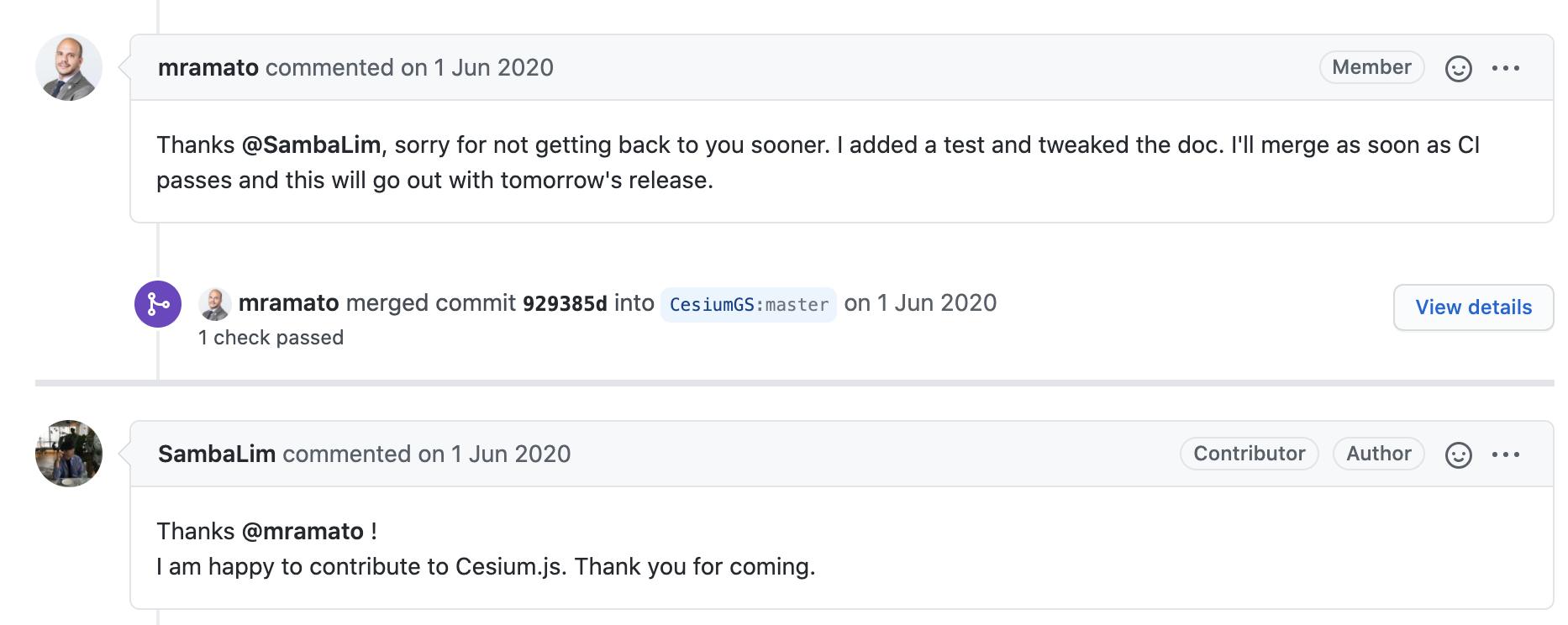 PR중 특히 completeFlight 메소드를 추가한 PR은 항상 사용만 하고 어떻게 동작하는지 보지 못했던 CesiumJS Camera 의 소스부분을 더 깊이 볼 수 있었고 무려 1달이 넘는 수정과 확인 끝에 merge되었습니다. 그리고 바로 다음버전에 추가 배포되어 정말 뿌듯했습니다.