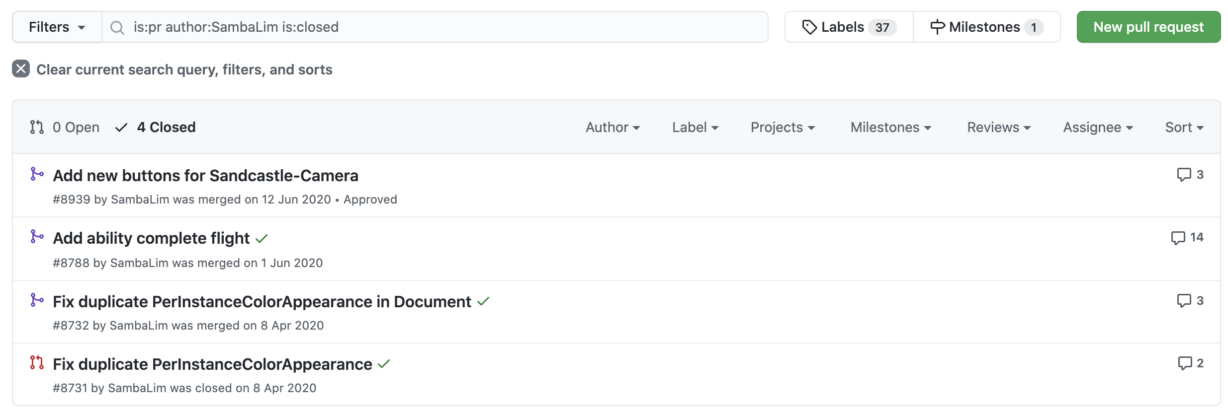 라벨이 붙은 Issue 들을 주로 찾아보았고 처음에는 간단한 문서 수정부터 카메라에 비행 완료 기능 추가, SandCastle 예제 수정 등 4번의 PR을 올려 merge되었습니다.