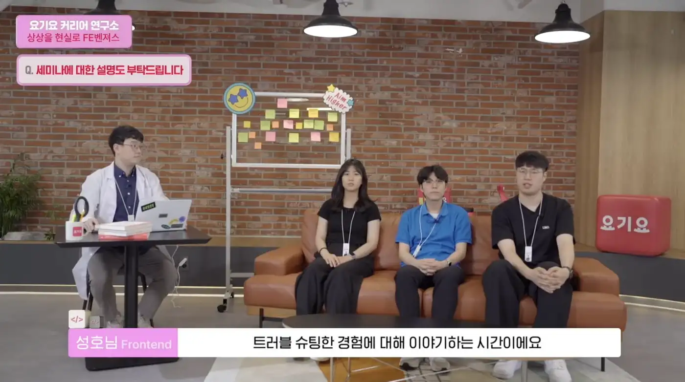 사내에서 진행한 채용설명회의 “상상을 현실로 FE벤져스”라는 세션에 참여햐였습니다. 카메라 앞에서 엄청 떨렸는데 나름(?) 경력자라고 최대한 떨지 않고 같이간 팀원들에게 힘을주려고 노력했던 것이 기억에 남습니다. FE 개발자로 지원하게될 분들에게 도움이 되기를 바라며 참여했습니다.