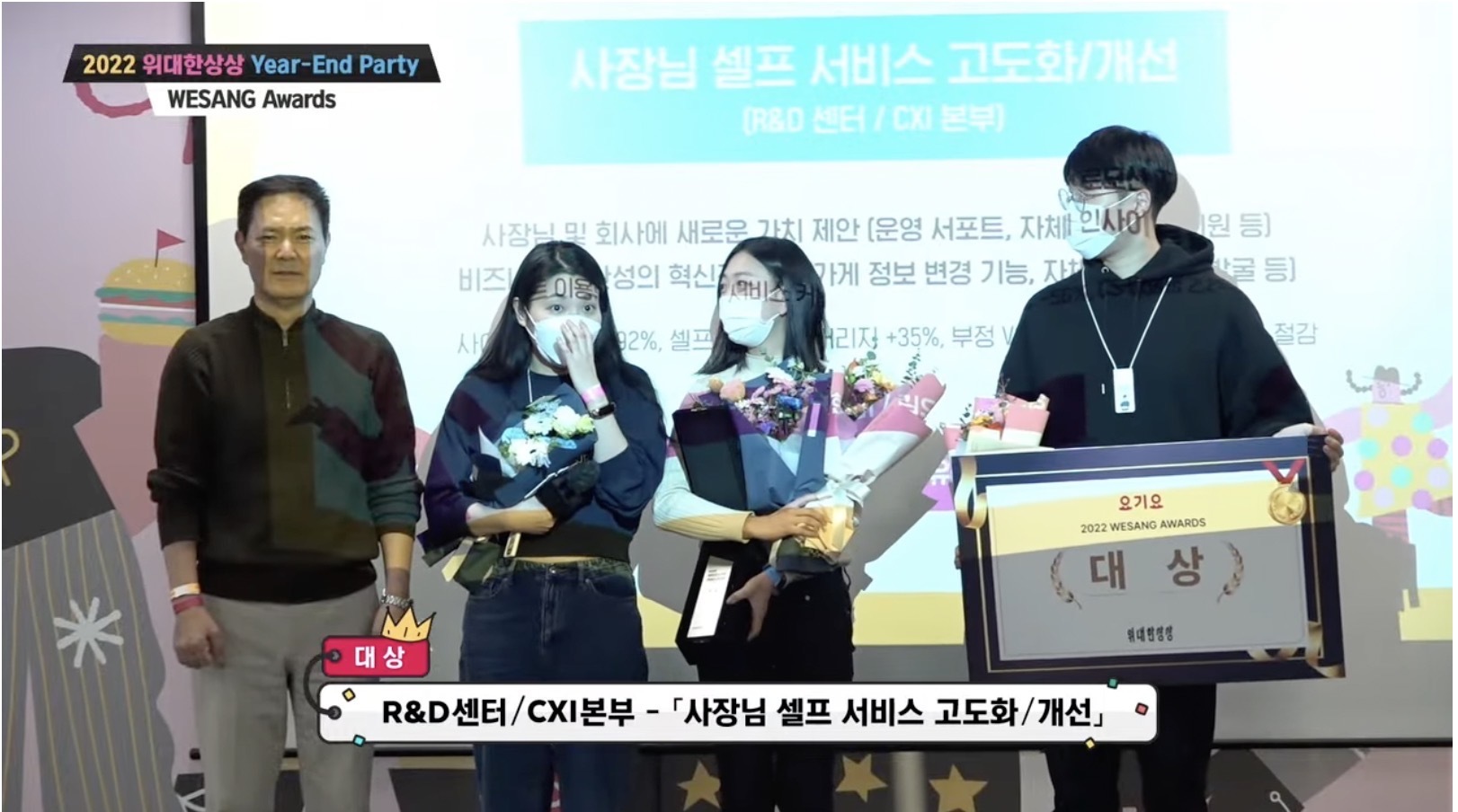 회사에서 진행한 Awards에서 사장님사이트 셀프서비스가 무려 “대상”에 선정되었습니다. 생각도 못한 일이였고 받으면서도 얼떨떨했습니다. 일년동안 함께 고생한 동료들이 많이 생각났고 상을 받고 있는 동안에도 내일 진행될 배포를 위해 고생하고 있는 팀원들이 생각이났습니다. 사실 상을 받은 후에 행사에 참여하지 못하고 내려가서 내일 배포를 위해 일을 했고 우리가 일하는 것에 변화는 없었습니다. 하지만 그동안 1위 업체에 비교당하고 안좋은 인식을 가지고 있던 사장님사이트의 서비스들을 개선하는 것에 회사에서도 관심을 가지고 응원한다는 느낌을 받아 기분이 좋았습니다. 그리고 리더분중 한 분이 특히나 좋아하셨는데 그 웃음 가득한 얼굴이 잊혀지지가 않습니다.