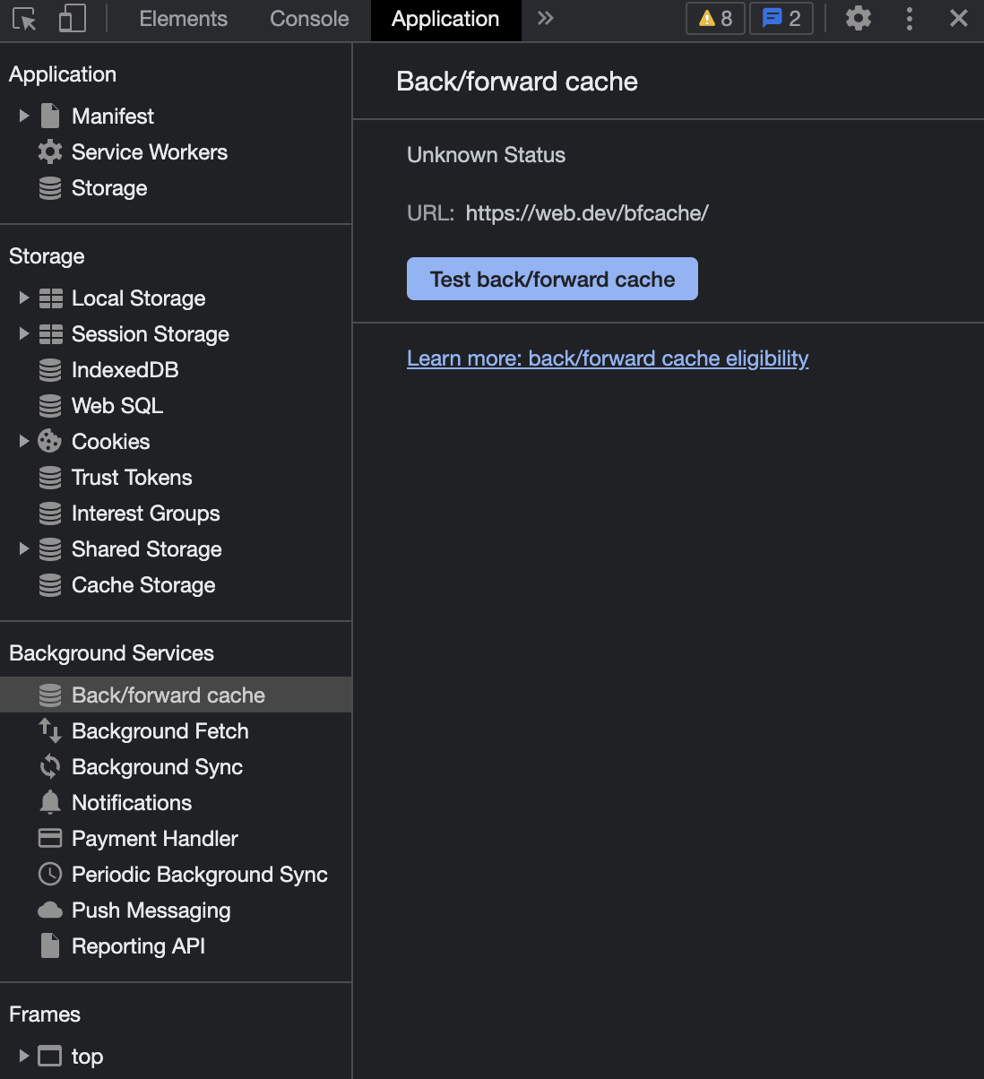 또한 Chrome Devtools에서는 페이지를 테스트하여 bfcache에 최적화 되어있는지도 확인해볼 수 있습니다. 이는 Application > Cache > Back-foward Cache에서 가능합니다.
