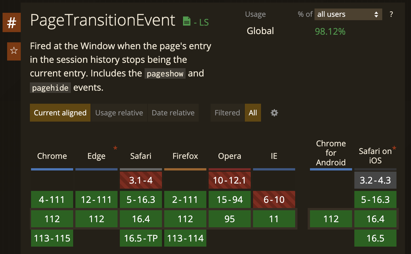 bfcache를 관찰하는데 주로 페이지 전환 이벤트(pageshow, pagehide)입니다. 이는 bfcache가 사용되는 경우 거의 모든 브라우저에서 지원해주었습니다.